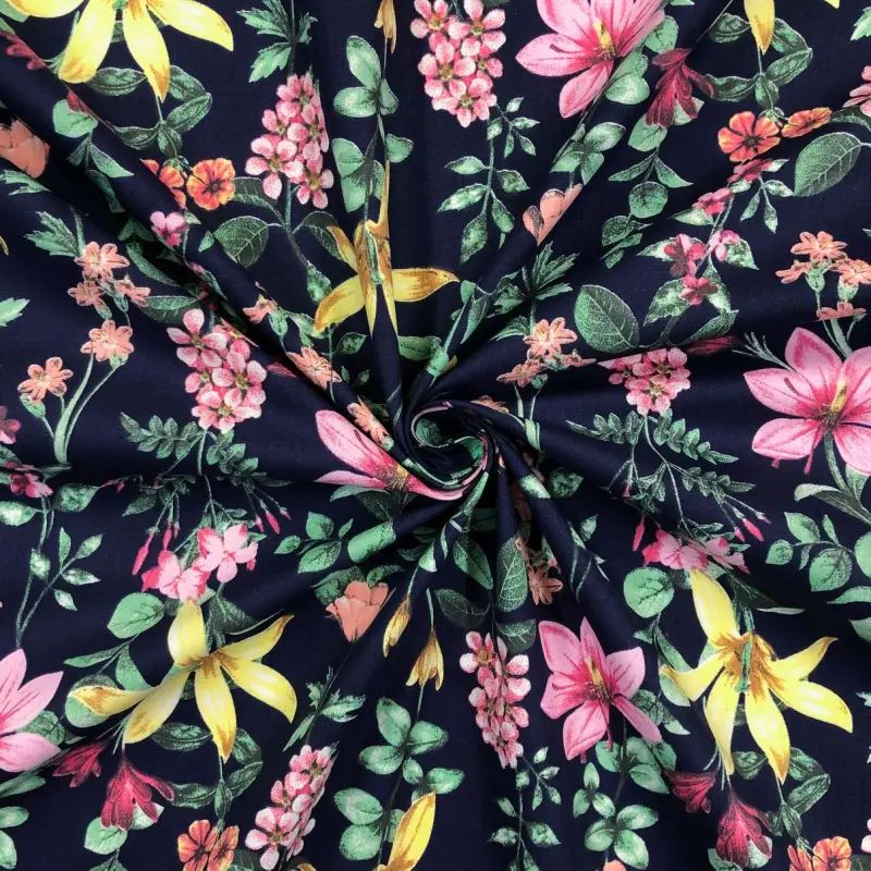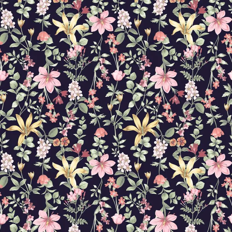 Tricoline Estampada - Ramos Flores Fundo Marinho - 100% Algodão - 1,50M Largura - Variante 1