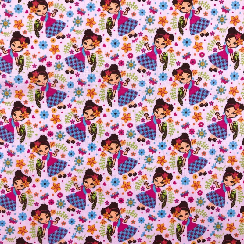 Tecido Tricoline Estampado - Menina Com Papagaio - 100% Algodão - 1,50M Largura - Variante 1
