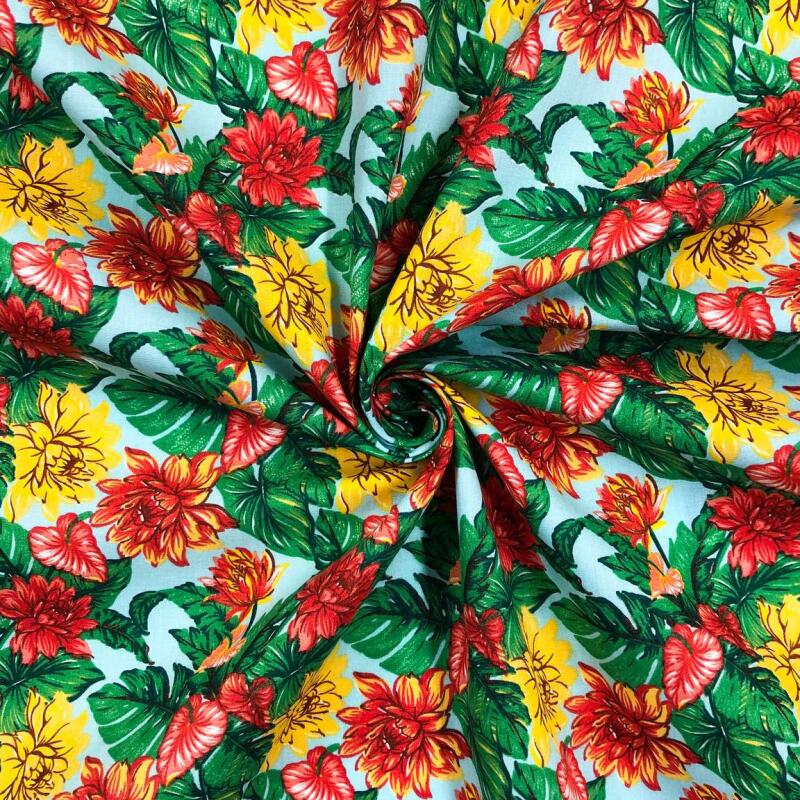 Tricoline Estampada - Tropical Fundo Azul - 100% Algodão - Variante 1