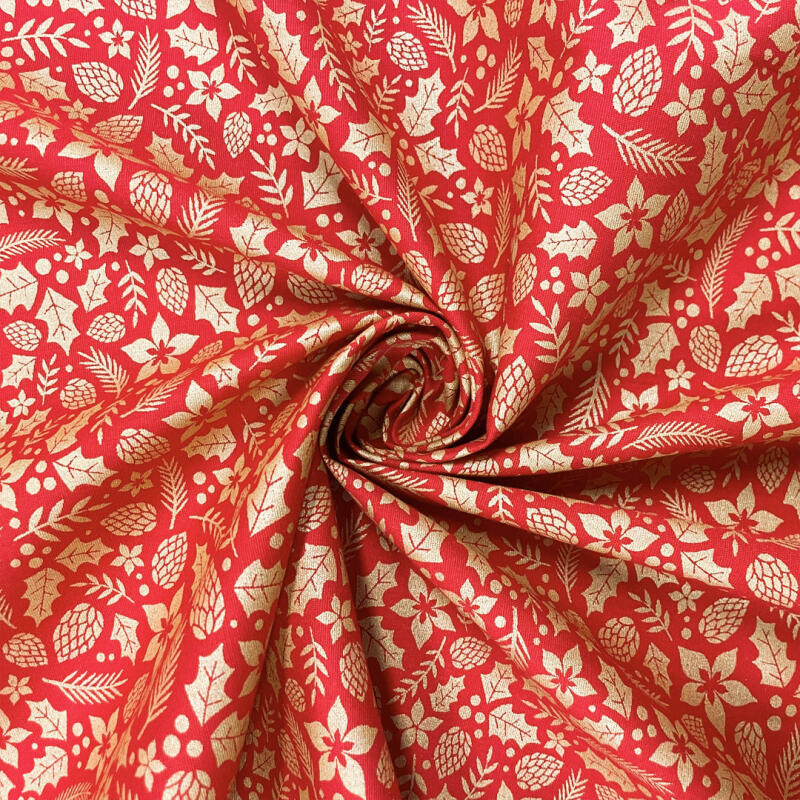 Tecido Tricoline Natal - Folhas Glitter Dourado - 100% Algodão - 1,50M Largura - Vermelho