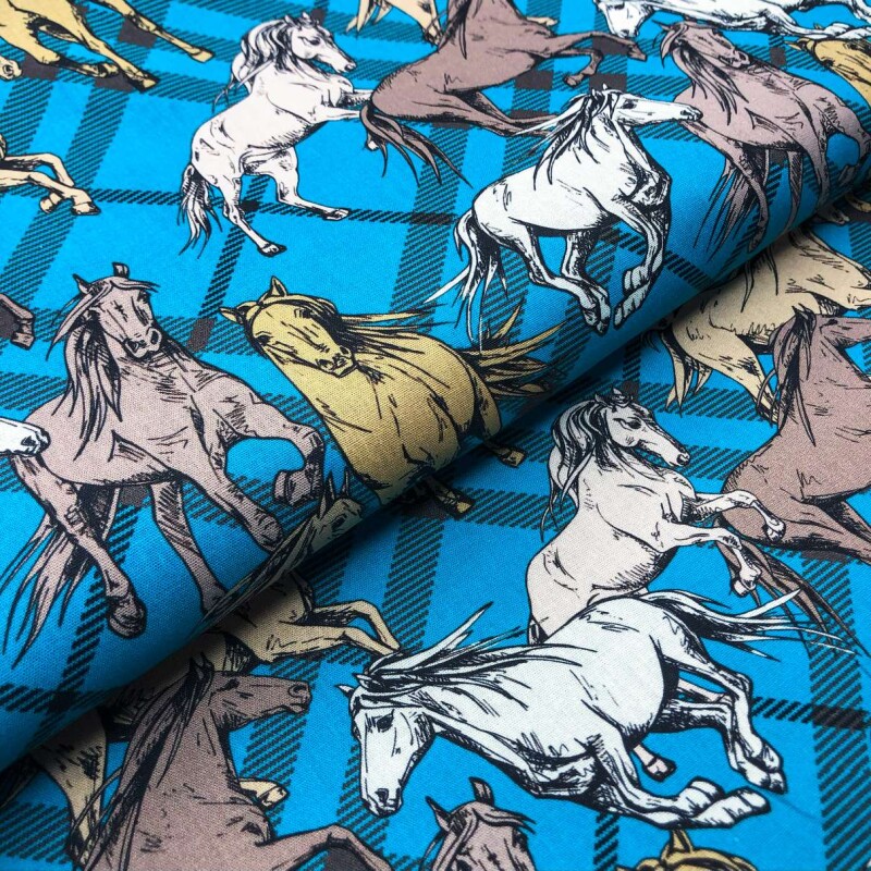 Tricoline Digital Cavalos Fundo Azul 100% Algodão - Variante 1