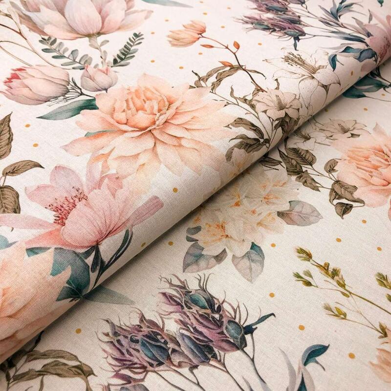 Tricoline Digital Floral Fundo Bege Com Poá 100% Algodão - Variante 1