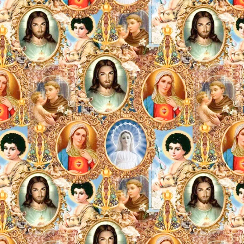 Tricoline Digital Sacro Medalha Rostos Santos 100% Algodão - Variante 1