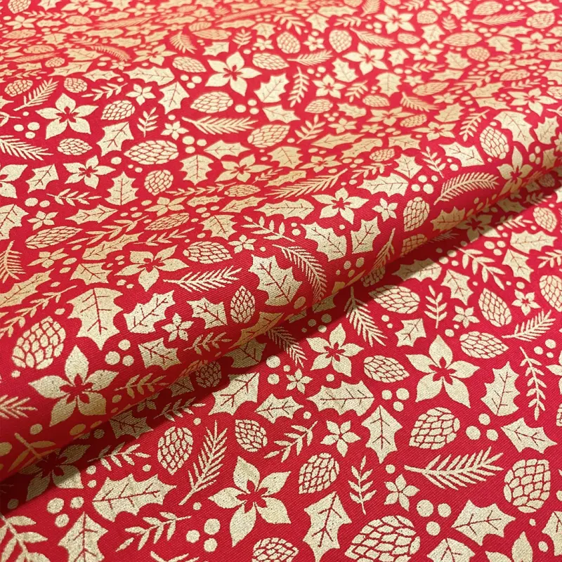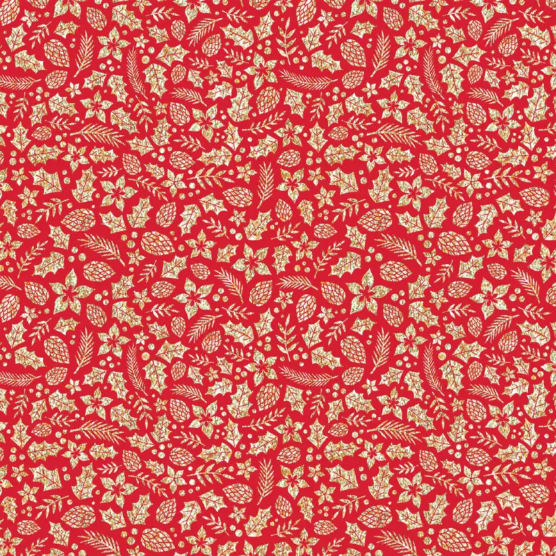 Tecido Tricoline Natal - Folhas Glitter Dourado - 100% Algodão - 1,50M Largura - Vermelho
