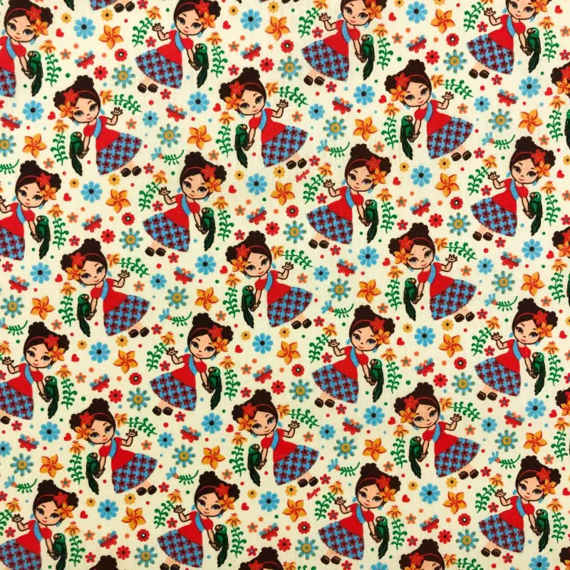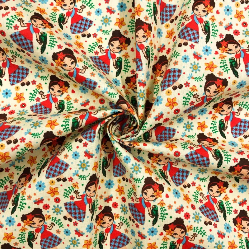 Tecido Tricoline Estampado - Menina Com Papagaio - 100% Algodão - 1,50M Largura - Variante 2