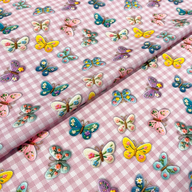 Tricoline Digital Borboletas Fundo Xadrez 100% Algodão 1,50M Largura - Variante 1