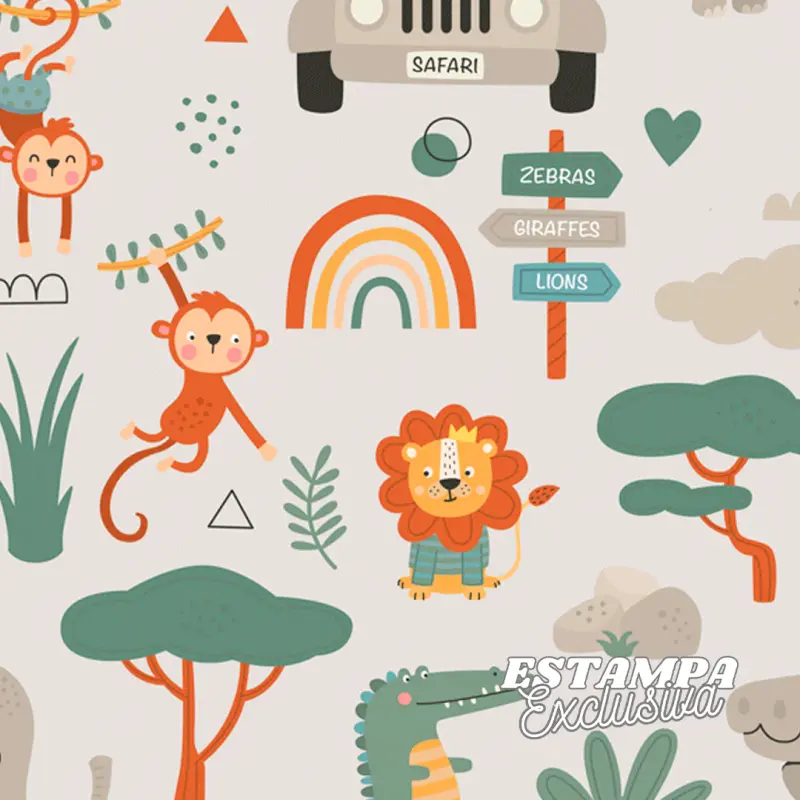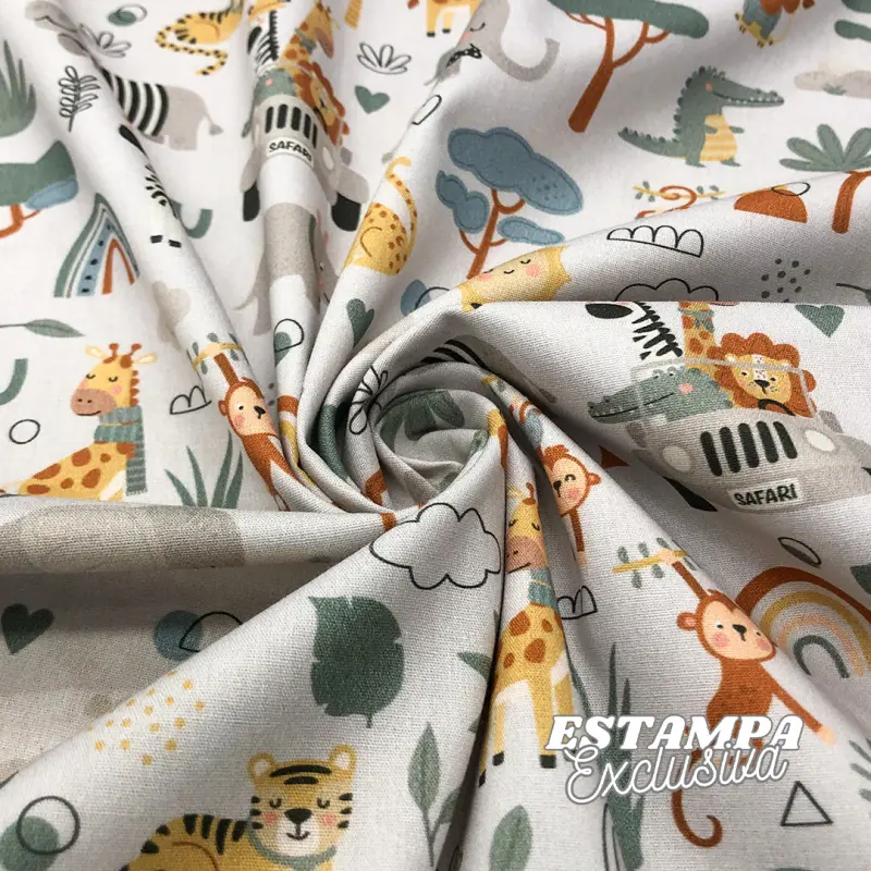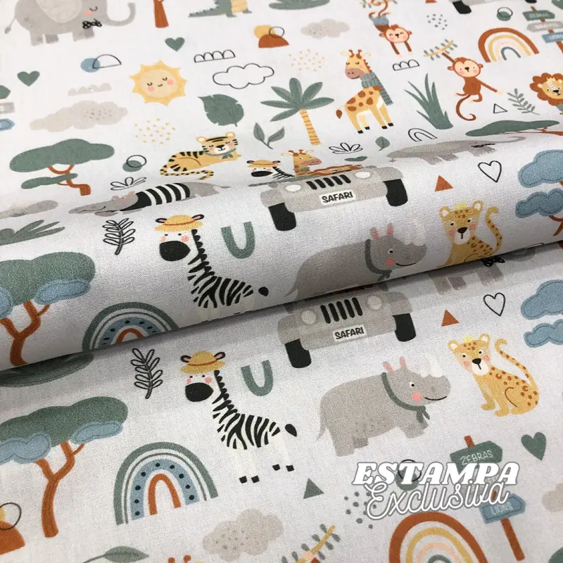 Tricoline Exclusiva Coleção Safari Universo Encantado 100% Algodão 1,50M Largura - Bicharada Fundo Branco
