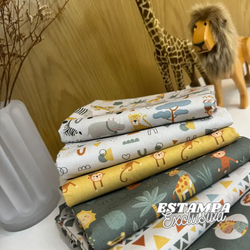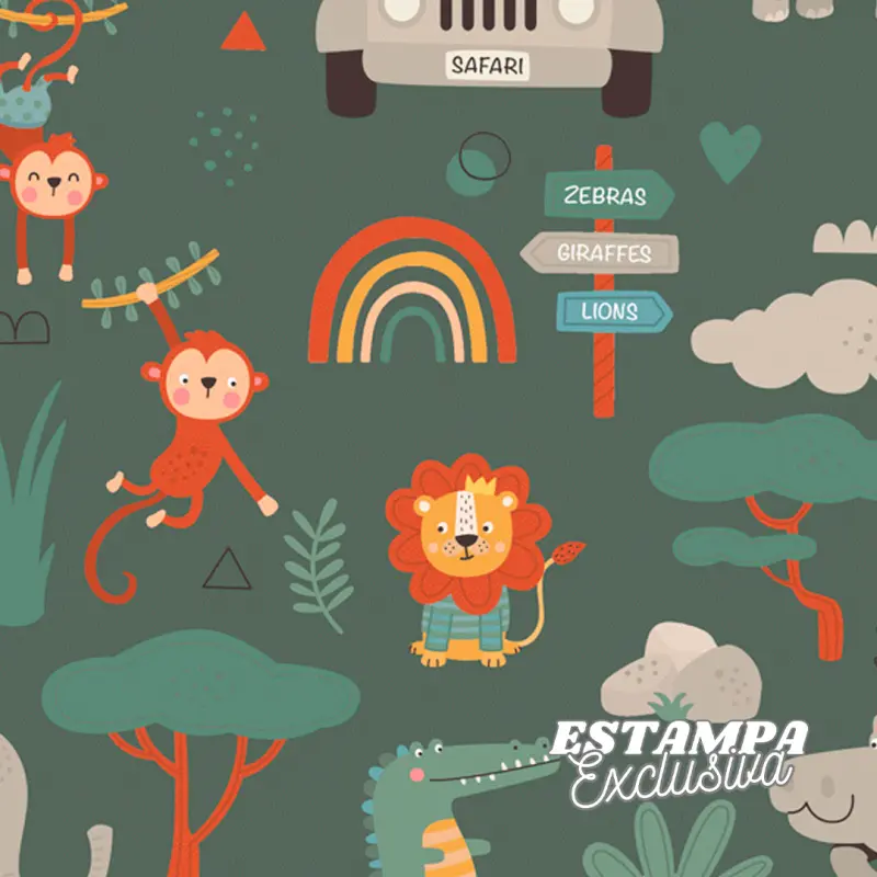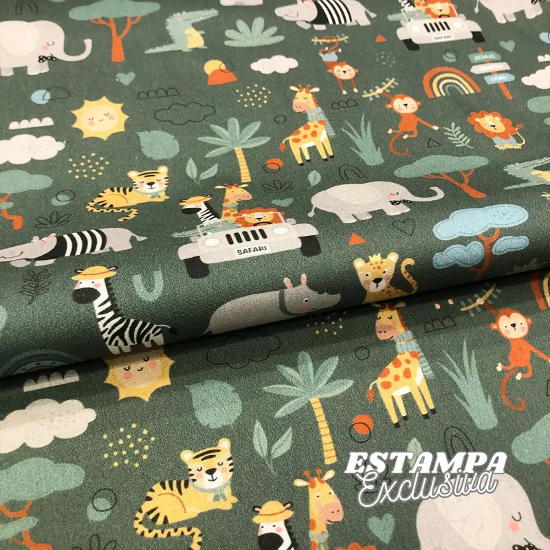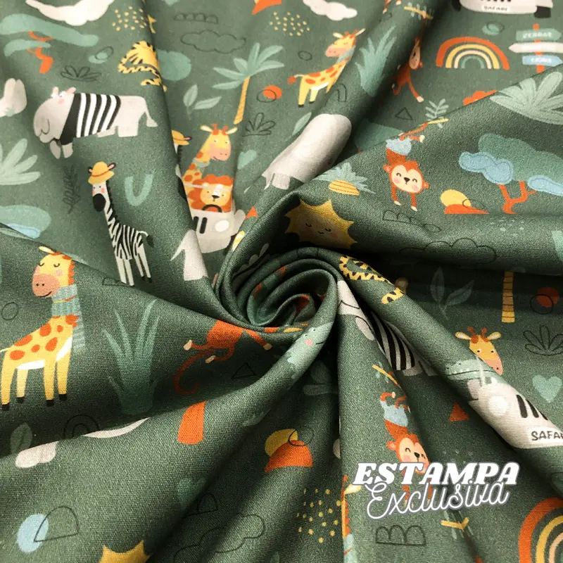 Tricoline Exclusiva Coleção Safari Universo Encantado 100% Algodão 1,50M Largura - Safari Fundo Verde