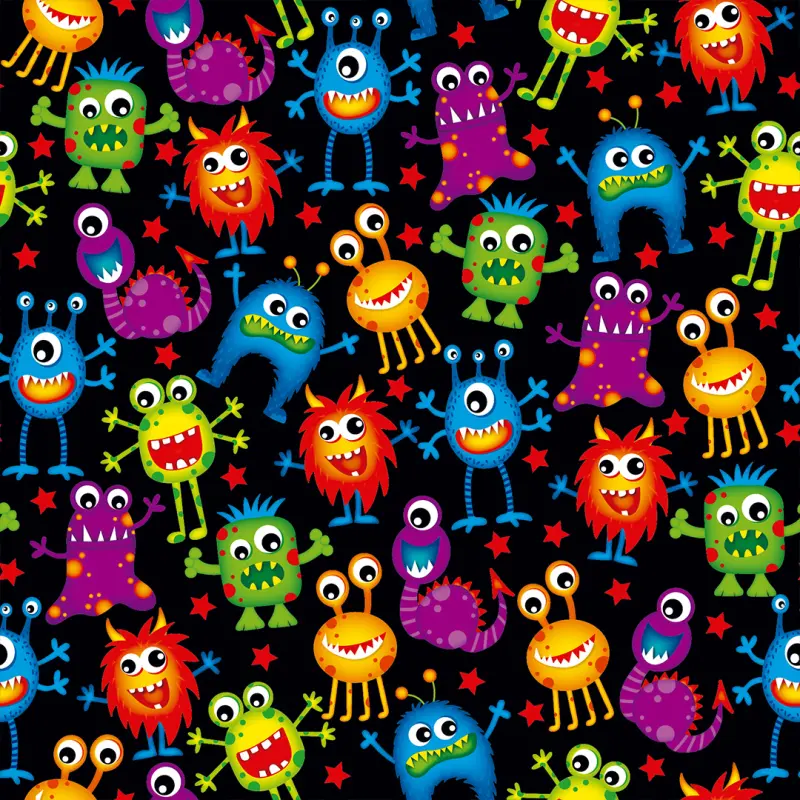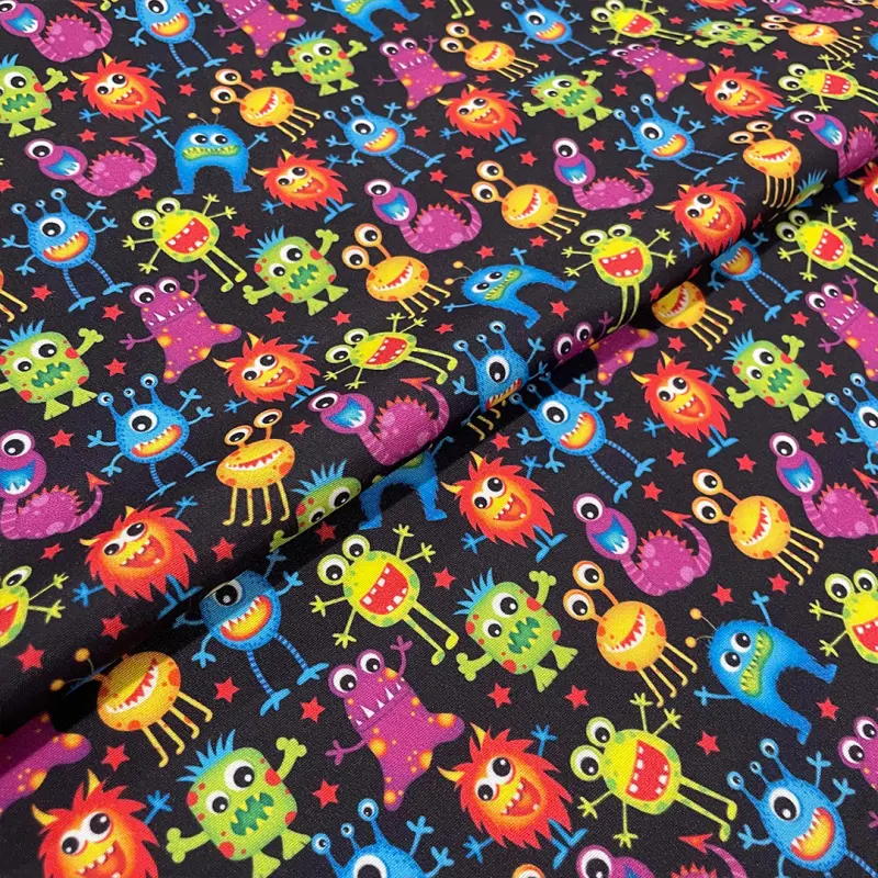 Microfibra Tactel Digital Estampa Exclusiva Coleção Monstrinhos 100% Poliéster - Fundo Preto